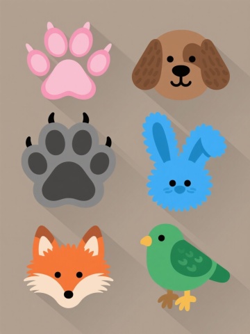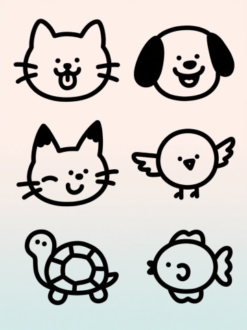 一套可爱的卡通动物系列素材集合,采用简洁明快的扁平化插画风格,纯色背景。画面中规整排布着三只不同造型、角度的猫和三只不同造型、角度的狗。所有动物均使用圆润流畅的线条绘制,呈现大头小身的Q版比例,眼睛为圆形或椭圆形并带有高光,表情生动可爱,充满童趣。猫的造型包括:一只戴着粉色蝴蝶结的白色短毛猫,表情乖巧;一只伸出粉色小爪子的灰色折耳猫,姿态活泼;一只眯着眼睛打哈欠的橘色狸花猫,神态慵懒。狗的造型包括:一只戴着蓝色小帽子的棕色腊肠犬,显得俏皮;一只吐着舌头、眼神温顺的黄色拉布拉多犬;一只耳朵竖起、露出开心笑容的黑色柯基犬。整体色彩明亮柔和,线条简洁干净,风格统一,适合作为系列素材使用。