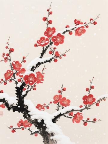 中国传统节日氛围的水彩风格插画,画面以纯净的白色为背景,营造出热闹喜庆的节日景象。主色调为温暖的红色和橙色,搭配深棕色的梅枝,色彩和谐统一。画面中央是几枝遒劲的梅枝,枝干上点缀着盛开的红色梅花,花瓣层次分明,边缘带有柔和的晕染效果。梅枝上悬挂着两个橙黄色的灯笼,灯笼表面装饰有精致的梅花图案,灯笼内部透出温暖的黄色光芒,照亮了周围的花瓣和枝干,光影过渡自然柔和。灯笼下方垂着红色的流苏,随风轻轻飘动,增添了画面的动感。整体构图采用不对称平衡,梅枝从右上角延伸至左下角,灯笼悬挂在枝干的不同位置,形成自然的视觉引导线。水彩特有的透明质感和柔和笔触贯穿整个画面,梅花的红色与灯笼的橙黄色相互呼应,共同营造出热闹、喜庆、温馨的节日氛围,适合作为节日主题的背景图使用。