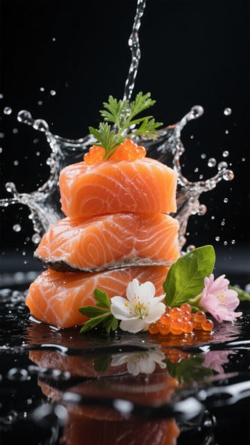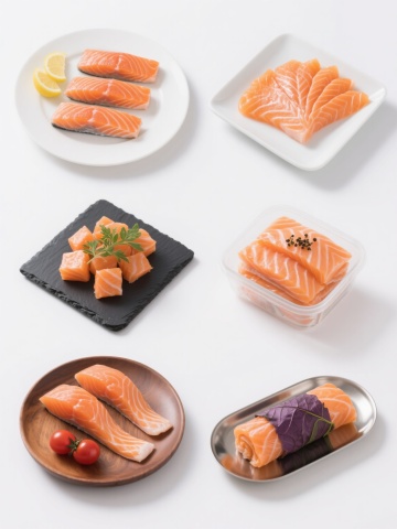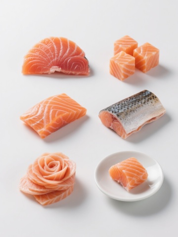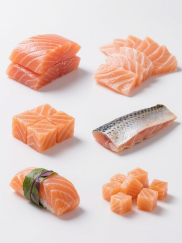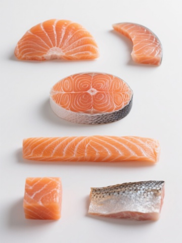 一条新鲜的三文鱼,身体呈流线型,背部为深蓝色,腹部银白色,鱼鳍和鱼尾边缘带有橙红色,鱼鳞细密有光泽,鱼头微微抬起,嘴巴自然闭合,眼睛明亮,整体姿态鲜活,悬浮在纯白色的纯色背景上,保持与原图相同的悬浮状态和构图布局,光线从上方照射,鱼身有明显的光影对比,突出鱼肉的质感和立体感。