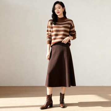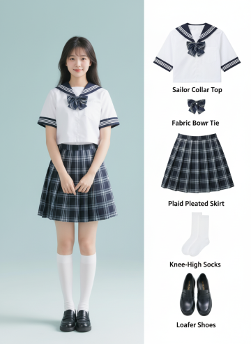 一位女性模特穿搭展示,身着白色短袖翻领衬衫,衬衫有胸前口袋和纽扣设计,搭配黑色中长款A字半身裙,脚穿米色运动鞋和白色中筒袜,右手自然下垂拿着一个棕色布面包袋,左手插在裙兜里,整体姿态自然放松。画面采用简约写实风格,背景为浅灰色纯色,光线柔和均匀,呈现出舒适、日常的穿搭氛围,色彩以黑白棕为主色调,和谐统一,突出服装的剪裁和质感。