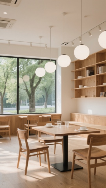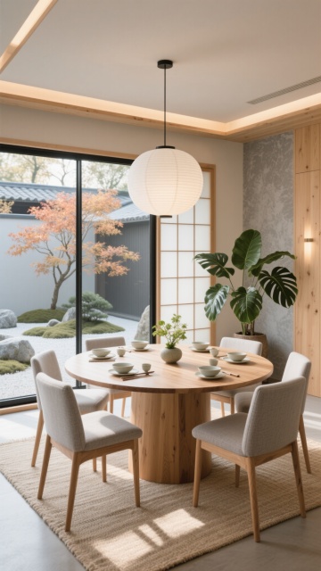 明亮开放的日式禅意风格餐厅内景,原木色餐桌搭配浅灰色布艺餐椅整齐排列,墙面装饰简约的浮世绘挂画与竹编隔断,天花板悬挂着线条流畅的纸灯笼吊灯散发柔和暖光,地面铺设浅色实木地板,窗边摆放着茂密的琴叶榕与日式枯山水小景,餐桌上摆放着素雅的陶瓷餐具与白色餐布,整体氛围宁静雅致,充满自然禅意,光线明亮柔和,空间通透开阔,符合日式料理餐厅的温馨舒适定位。
