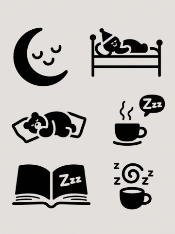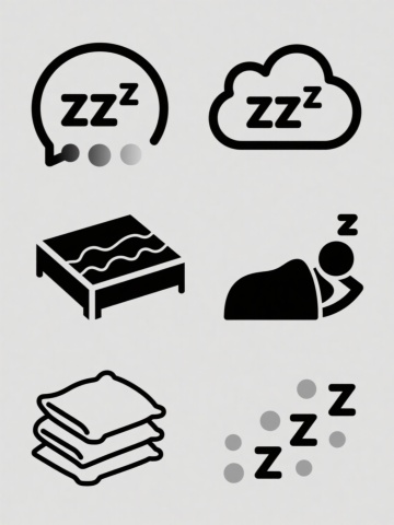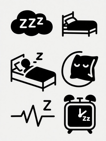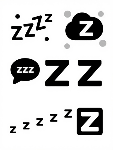 极简风格睡眠主题系列图标集合,纯白纯色背景,六个完全不同的睡眠元素规整排布,每个元素均采用原图的纯黑与白色块对比、简洁几何线条、无渐变无阴影的平面设计风格:1. 左侧上方:经典"ZZZ"睡眠符号以不规则大小和角度排列,点缀几个黑色圆点;2. 中间上方:黑色云朵形状气泡内包含"zzz"文字;3. 右侧上方:单个大号"Z"字母,周围有几个灰色小圆圈装饰;4. 左侧下方:两个不同大小的圆角对话框气泡,内部分别有"zzz"文字,带短小的气泡尾巴;5. 中间下方:三个水平排列的"Z"字母,大小一致;6. 右侧下方:一条由小到大渐次排列的"z"字母组成的斜线,末端是一个黑色矩形框内包含"zzz"文字。所有元素保持与原图一致的现代、简约、扁平化设计语言,视觉层级清晰,信息传达直接,适合作为睡眠相关的UI图标或装饰元素使用。
