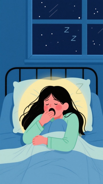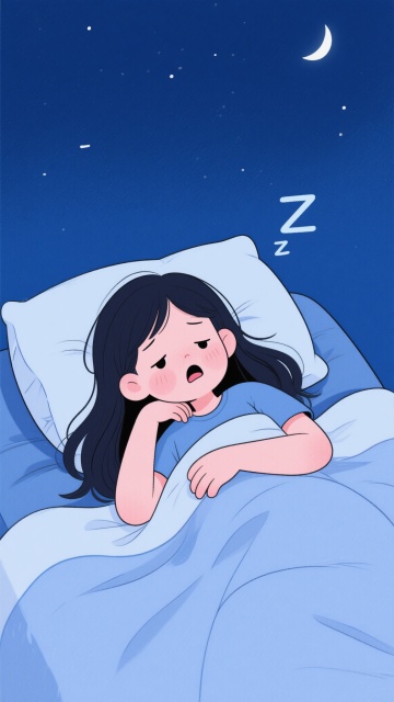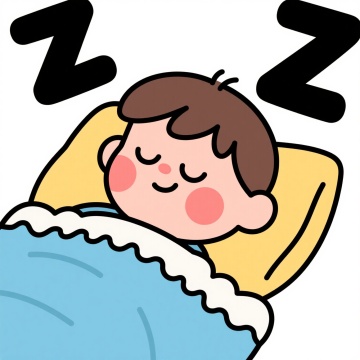 一个熟睡的小男孩,棕色短发,闭着眼睛,脸颊带着红晕,嘴角微微上扬,头枕着枕头,身体被被子包裹,上方有“Zzz”的睡觉符号,采用扁平风格,纯白背景,整体以柔和的蓝色为主色调,被子为淡蓝色,枕头为深蓝色,线条简洁流畅,色彩明快清新,充满温馨舒适的氛围。