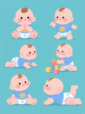 A set of 6 illustrations in a unified flat vector style with bright, cheerful colors and soft gradients, featuring children with round faces, big expressive eyes, and simple, cute clothing details, arranged in a规整 grid layout on a solid color background. Each illustration depicts a different child action: 1. A child sitting cross-legged on the grass, holding an open book with a focused expression, wearing a white shirt and blue shorts, with a small backpack beside them. 2. A child writing in a notebook at a wooden desk, head slightly tilted in concentration, wearing a yellow sweater and gray pants, with a pencil case and eraser on the desk. 3. A child standing upright with a red backpack on both shoulders, hands gripping the straps, smiling confidently, wearing a green shirt and black shorts, with a small lunchbox in one hand. 4. A child with arms wide open, standing on tiptoes as if embracing the wind, wearing a pink dress and white shoes, hair flowing slightly, with small leaves floating around. 5. A child mid-run, legs in a dynamic stride, arms pumping at the sides, wearing a blue tracksuit and sneakers, with a determined expression and hair blowing back. 6. A child kicking a soccer ball, one leg extended behind, arms outstretched for balance, wearing a black and white striped jersey and red shorts, with the ball in mid-air near their foot. All illustrations maintain the same soft lighting, minimal shadows, and playful line work, with each child having distinct hair colors and styles, and small floating elements (leaves, paper airplanes, stars) matching the theme of each action, set against a clean, solid background in a vibrant but harmonious color palette that differs from the original while保持ing the overall cheerful aesthetic.