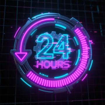 24 HOURS文字与顺时针箭头构成的圆形标志,采用扁平风格设计,黑色线条简洁流畅,白色背景纯净,箭头与环形跑道元素体现时间循环与持续服务,整体造型简约现代,信息传达清晰直观,符合24小时服务的品牌标识特征。