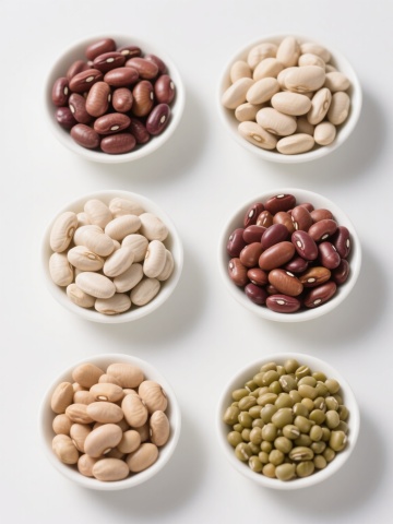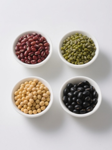 纯色背景,极简风格,六个不同元素的规整排布集合,每个元素独立占据一个区域,整体色彩变换统一协调,每个元素都具有高清晰度的摄影质感,光线柔和自然,物体边缘清晰,阴影细腻。第一个区域:装满金黄色玉米粒的粗麻布麻袋,旁边放着一个装满玉米粒的木勺,散落几颗玉米粒,旁边有一个完整的玉米棒。第二个区域:装满深红色红豆的粗麻布麻袋,旁边放着一个装满红豆的木勺,散落几颗红豆,旁边有一枝带叶的红豆枝。第三个区域:装满深绿色绿豆的粗麻布麻袋,旁边放着一个装满绿豆的木勺,散落几颗绿豆,旁边有几片绿豆叶。第四个区域:装满浅棕色燕麦片的粗麻布麻袋,旁边放着一个装满燕麦片的木勺,散落几片燕麦片,旁边有一株燕麦穗。第五个区域:装满白色糯米的粗麻布麻袋,旁边放着一个装满糯米的木勺,散落几颗糯米,旁边有一片粽子叶。第六个区域:装满浅粉色小米的粗麻布麻袋,旁边放着一个装满小米的木勺,散落几颗小米,旁边有一枝带穗的小米杆。