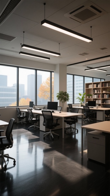 高写实3D渲染风格的现代办公室内部场景,采用明亮通透的采光设计,大面积落地窗引入自然光,窗外可见城市高楼与秋季树木景观。室内以浅灰色、白色和原木色为主色调,搭配深灰色地面,形成简洁专业的色彩和谐。天花板悬挂整齐排列的长方形LED平板灯,与自然光共同营造柔和均匀的光影效果,地面投射出清晰的窗格阴影。开放式办公布局,配备浅色实木办公桌、黑色办公椅、白色文件柜和黑色电脑显示器,书架上整齐摆放书籍和文件夹,窗台及办公桌角落点缀绿色植物增添生机。空间线条简洁流畅,展现出现代、简约、高效的办公氛围,可从不同角度(如靠窗视角、办公室中央视角、走廊视角等)展示,环境可替换为不同城市景观(如商业区、公园旁、海滨等)的办公室背景。