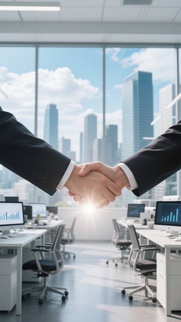 现代化办公空间背景,采用高清3D渲染技术,呈现出与原图一致的超写实风格,以通透的蓝色系为主色调,搭配白色和浅灰色作为中性色,营造明亮、专业、科技感的氛围。场景中包含玻璃幕墙的高层写字楼外观,建筑线条流畅锐利,表面有细腻的金属质感和反光效果,如同原图中高耸的摩天大楼。光线从侧上方照射,形成清晰的光影对比,天空呈现渐变的蔚蓝色,点缀着少量白色云朵,增强空间的开阔感。办公区域可设置开放式工位、简约的会议桌、舒适的沙发座椅,地面采用浅色木地板或大理石材质,墙面装饰简约的艺术画作或绿植,整体布局遵循对称美学和视觉引导线,确保画面层次分明,符合现代办公环境的高效与专业特质,同时保持与原图在光影、色彩和谐度及3D质感上的高度统一。