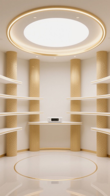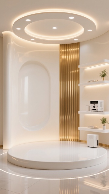 3D rendering of a modern, minimalist live broadcast room background with a warm beige and gold color scheme, featuring smooth curved walls, vertical gold ribbed panels, recessed LED strip lighting, a circular ceiling light fixture with a golden trim, glossy white flooring, and floating shelves with a small camera-like device; designed with a clean, elegant aesthetic, soft ambient lighting, and a focus on creating a professional yet inviting atmosphere for live streaming, presented from different angles and with varied shelf arrangements.