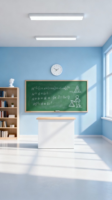软3D风格,一块挂在白色背景上的木质边框黑板,木质边框呈现自然的浅棕色木纹,带有细小的纹理细节,质感柔和不生硬,黑板主体为深绿色,表面平滑,边缘与木质边框衔接自然,顶部通过两条棕色的细链条悬挂,链条两端连接在边框顶部的金属挂钩上,金属挂钩为浅金色,带有轻微的光泽感,黑板下方的左下角放置着两块彩色的黑板擦,一块是粉红色的,另一块是黄色的,旁边还有一支绿色的粉笔,整体画面色彩和谐,光影柔和,呈现出轻松、简洁的氛围,物体边缘圆润,立体感通过柔和的阴影和微妙的渐变来表现,没有强烈的明暗对比,整体风格统一、柔和、清新。