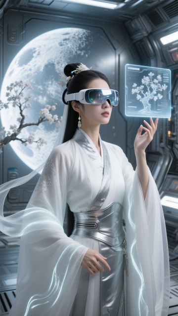 数据流编织成的连帽斗篷,实时滚动着发光代码,搭配霓虹网格紧身衣,黑客空间站场景,数字艺术