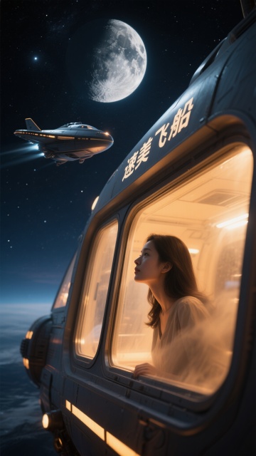生成了一张写实摄影风格的星空场景图片,画面中远处有月球,刻着“速美飞船”的飞船正在飞行,飞船窗户朦胧,女人凝视窗外,暖光氛围神秘温馨,尺寸为9:16(576×1024像素)。