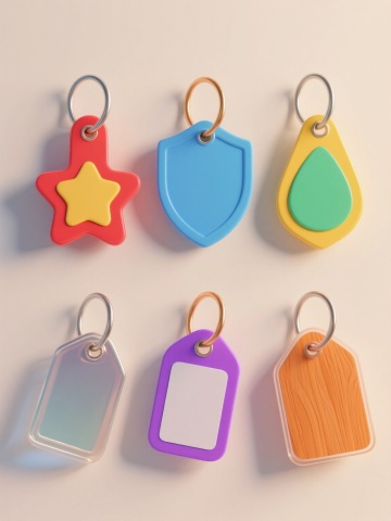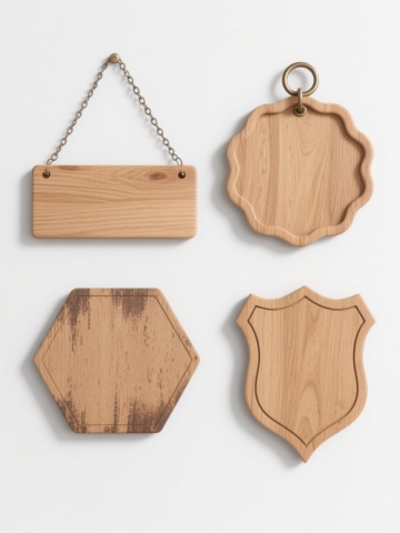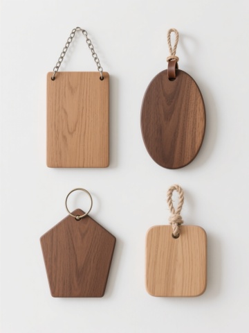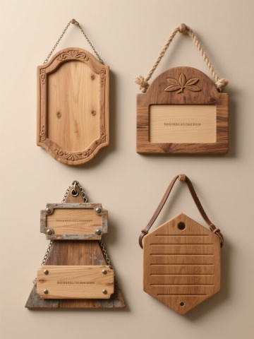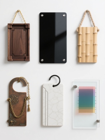白色背景下,六个不同样式、不同风格、不同材质的门牌整齐排列。这些门牌包括一块深棕色实木门牌,带有明显木纹和金色链条悬挂,边框有精致的榫卯结构和倒角处理,呈现出古朴典雅的质感;一块光滑的黑色亚克力门牌,表面有磨砂与高光的对比,边缘切割锐利,搭配银色金属挂钩;一块复古铜制门牌,表面有做旧处理和浮雕花纹,链条为仿古黄铜材质;一块浅色竹制门牌,保留竹节纹理,边缘打磨圆润,配以麻绳悬挂;一块带有简约线条设计的白色陶瓷门牌,表面有细微的冰裂纹理,金属挂环为哑光黑色;还有一块现代感的透明玻璃门牌,内部夹有彩色胶片层,通过金属支架固定。所有门牌在统一的白色背景下保持整齐的水平排列,间距均匀,每个门牌都有清晰的悬挂结构,整体光影统一,呈现出柔和的顶部光源效果,阴影细腻自然,突出各种材质的质感差异和独特风格。