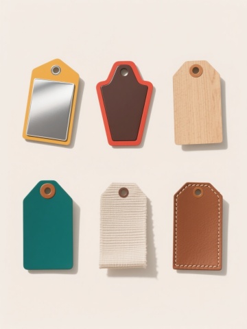 6个不同配色、不同样式、不同材质的价格标签造型,浅色背景,上下两行对齐排列,无任何文字,每个标签具有光滑边缘、轻微立体阴影和高光效果,类似原图的简约扁平风格,标签材质分别呈现金属质感、磨砂塑料、木质纹理、光滑亚克力、布面纹理和玻璃透明感,色彩鲜艳且对比鲜明,整体构图整齐有序,视觉层次清晰。