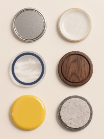 六个不同材质的圆形徽章规整排布在纯色背景上,每个徽章保持相同的圆形造型和大小,从左到右、从上到下分别为:1. 磨砂金属质感,呈现哑光银灰色,表面有细腻的磨砂纹理和一圈亮银色细边框;2. 光滑陶瓷质感,米白色底色,带有自然的细微瓷纹,边缘为淡金色描边;3. 透明亚克力质感,纯净无色,内部有轻微的云雾状纹理,边框是半透明的深蓝色;4. 复古木纹质感,深棕色底色,清晰可见木材的年轮和纹理,边框为同色系的深色实木;5. 光滑塑料质感,鲜艳的亮黄色,表面有高光泽度,边框是同色的稍深黄色;6. 哑光石材质感,浅灰色底色,带有自然的石质纹理和细小颗粒,边框为深灰色石质。整体构图整齐有序,每个徽章之间间距均匀,背景为简约的浅米色,突出展示不同材质的质感差异。
