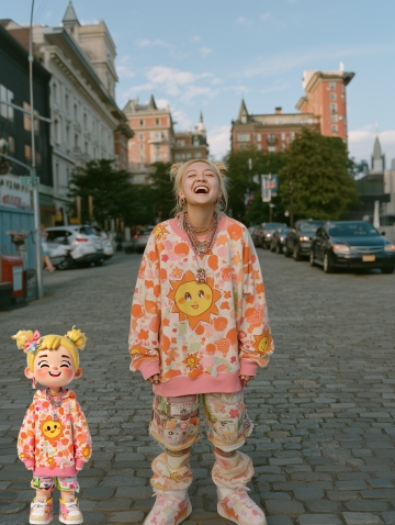 时尚潮流city pop风,拟人卡通角色与真人同框,展现活力与创意。
