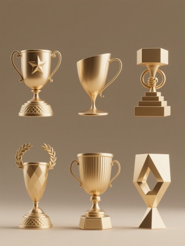 一套6张系列素材集合,每张均为简约现代风格的单一元素图案,规整排布。保持与原图一致的3D渲染质感,金色金属材质,光滑表面带有细腻高光和阴影,纯色背景。第一张:带有五角星浮雕的双耳奖杯,杯身圆润,底座有菱形纹路;第二张:简约线条设计的单耳流线型奖杯,杯口呈倾斜角度,底座为圆形;第三张:多层阶梯式底座的高脚杯造型奖杯,杯身两侧有对称弧形装饰;第四张:带有环形握手设计的方形杯身奖杯,表面有横向条纹肌理;第五张:顶部带有月桂叶环绕装饰的古典风格奖杯,底座为六边形;第六张:几何切割面构成的现代感奖杯,杯身有三角形镂空设计,整体棱角分明。所有奖杯均居中放置,保持统一的光影效果和视觉比重,强调金属的光泽感和立体感。