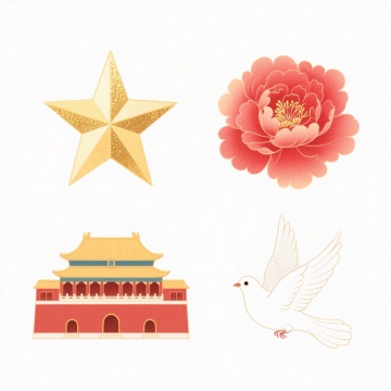 一套4张的系列素材集合,每张素材均为规整排布的单一建筑造型图案,包含鸟巢、故宫、天坛、东方明珠基本元素内容,整体造型简约现代,采用纯色背景。每张图案均为金色磨砂质感的建筑剪影,边缘有白色高光勾勒,建筑细节进行了几何化简化处理,保持对称平衡的构图,背景为纯白色,无其他装饰元素,整体呈现出简洁、大气、具有现代设计感的视觉效果。