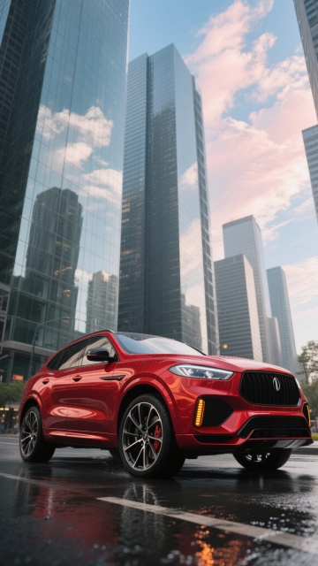 低角度仰拍,一辆熔岩红色豪华SUV正以完美姿态驶过城市中央商务区的玻璃幕墙建筑群之间,车身流畅的肌肉线条在正午阳光下折射出如同液态金属般的光泽,引擎盖与车顶的曲面精确捕捉着天空的湛蓝与云朵的棉白,22英寸多辐式轮毂在柏油路面投下几何阴影。背景中,现代主义风格的摩天楼群拔地而起,玻璃与钢结构的冷灰色调与车辆的热烈红色形成高级对比,天际线处几缕卷云被阳光染成淡淡的金粉色。车侧转向灯以柔和的琥珀色闪烁,车窗倒映着周围建筑的流动光影,前大灯锐利如鹰隼凝视前方,空气动力学套件的细节在高光与阴影的交错中彰显精密工艺。路面湿润的水痕反射着车身色彩,暗示着清晨阵雨的离去,整个画面在明亮天光下呈现出锐利的对比度和丰富的层次感,完美平衡了力量感与优雅气质。