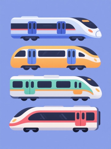 一组6个不同元素内容的系列素材集合,每个元素均采用扁平化插画风格,规整排布在纯色背景上,整体色彩变换且保持统一的色彩和谐度,每个元素都具有圆润的线条、简洁的形态、平滑的渐变过渡和清晰的高光表现,光影效果柔和,物体边缘清晰,无复杂细节,呈现出简洁明快、现代感十足的视觉氛围。元素内容分别为:1. 橙色流线型高速列车,车头圆润,车身有横向长窗;2. 蓝色双层巴士,车身方正,车窗排列整齐,车顶有天窗;3. 绿色货运卡车,车头宽大,车厢为封闭式,车轮较大;4. 红色直升机,机身流线型,有机翼和尾桨,驾驶舱透明;5. 紫色帆船,船体修长,有白色帆布帆,船帆呈三角形;6. 黄色潜水艇,艇身圆润,有观察窗和螺旋桨,顶部有潜望镜。所有元素大小一致,间距均匀,呈两行三列整齐排列。