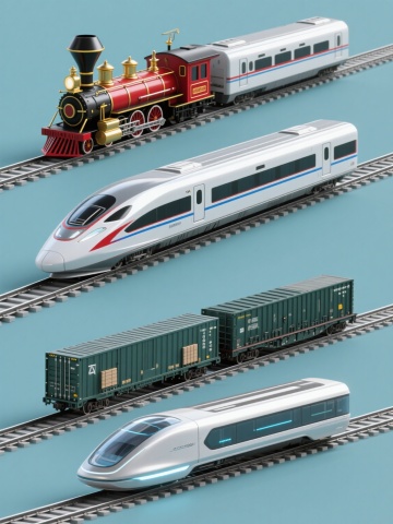 一系列6个现代交通工具主题的插画集合,每个元素采用不同纯色背景(如蓝色、绿色、紫色、红色、黄色、灰色),保持原插画的3D立体风格、圆润流畅的线条、光滑的金属质感和明亮柔和的光影效果,画面整体色彩变换为对应纯色背景的和谐色调,元素类目为交通工具,包括高速列车、飞机、轮船、汽车、地铁、自行车,每个交通工具都有独特的颜色搭配和细节设计,所有元素规整排布,形成统一且富有变化的系列素材。
