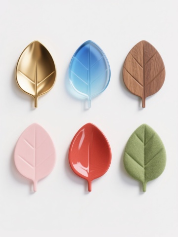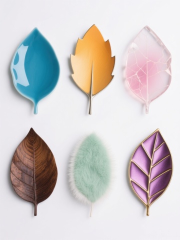 纯白背景上规整排布的六个不同材质的叶子系列素材集合,每个叶子保持原图像中的相同造型和轮廓线条,包含单片叶、双片叶等多种形态,整体色彩变换为丰富多样的色调,第一个叶子呈现光滑亮泽的陶瓷材质质感,带有细腻的釉面反光和柔和色彩;第二个为磨砂金属材质,表面有细微颗粒感和哑光金属色泽;第三个是透明水晶材质,晶莹剔透,带有内部折射光影效果;第四个是木质纹理材质,展现自然的木纹肌理和温暖色调;第五个是柔软的织物材质,具有布面纹理和轻微褶皱感;第六个是光滑的塑料材质,带有半透明感和均匀的色彩分布,所有叶子元素在白色背景上整齐排列,形成一组视觉统一又各具特色的系列素材,整体保持简洁现代的设计感,信息传达清晰直观。