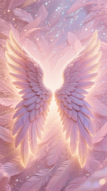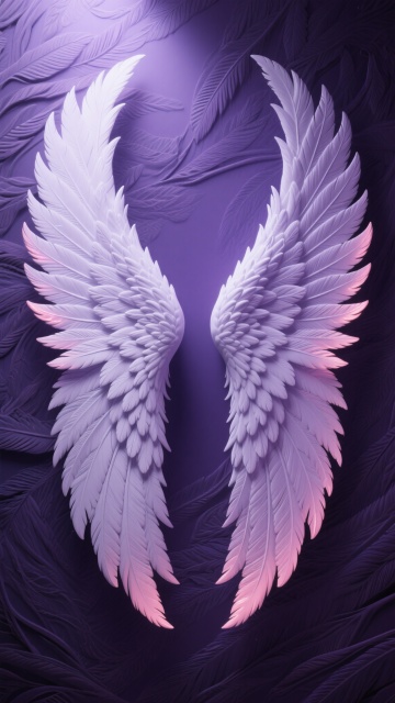 一张具有强烈3D浮雕质感的艺术海报,中心是一对巨大而精致的白色羽毛翅膀,羽毛层次分明,每一片都有细腻的纹理和轻微的弯曲弧度,翅膀呈现出对称的、微微向中心收拢的姿态,仿佛守护着什么。背景是同样质感的羽毛纹理,与翅膀形成和谐统一的整体。整体色调变换为深邃神秘的暗紫色调,翅膀主体为柔和的薰衣草紫,羽毛边缘带有珍珠般的淡粉色高光,背景则是更深的茄紫色,营造出梦幻而略带忧郁的氛围。光线从上方偏左的位置柔和照射下来,在翅膀的内侧和羽毛的重叠处形成自然的阴影,增强了整体的立体感和空间层次。画面充满了细腻的材质感,羽毛的轻盈与浮雕的厚重感奇妙地结合在一起,整体构图对称且平衡,视觉焦点集中在翅膀的中心位置,给人一种神圣而静谧的感觉。