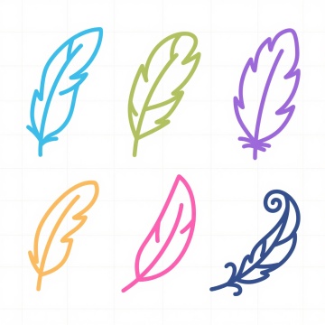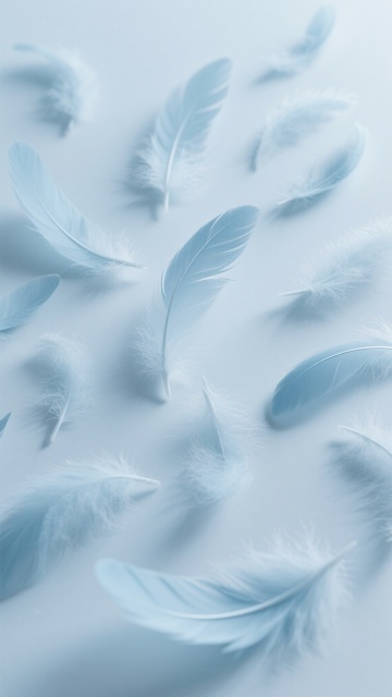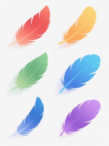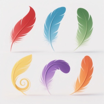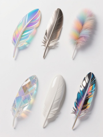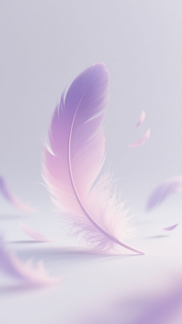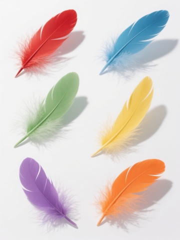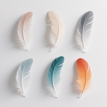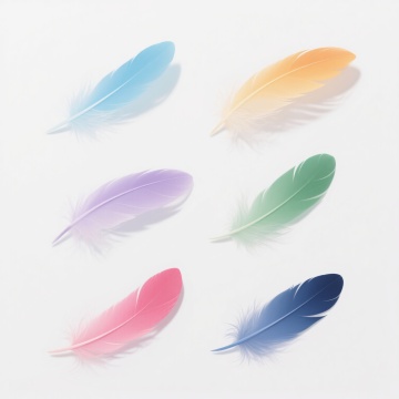 多根轻盈飘逸的羽毛,以散落悬浮的姿态分布在纯净的白色背景上,羽毛边缘带有细腻柔和的白色描边,整体呈现出简约、空灵、唯美的插画风格,光影处理柔和,强调羽毛的轻盈质感与透明感,色彩变换为淡粉色、淡蓝色、淡紫色、淡黄色等柔和的马卡龙色系,保持羽毛原有的形态和飘逸感,营造出梦幻、浪漫的氛围。