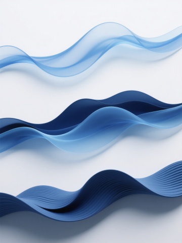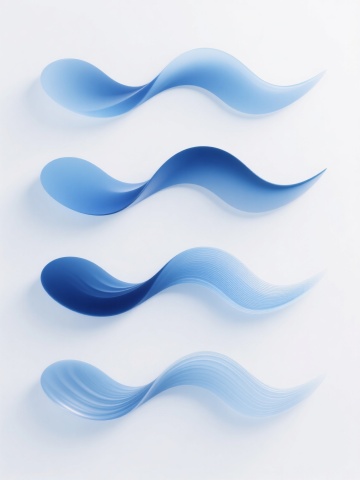 一个系列集合,包含三个完全不同造型和角度的抽象波浪线条设计元素,每个元素都保持相同的蓝色渐变配色方案,采用数字艺术风格,线条平滑流畅,具有透明感和层次感,背景为纯白色,整体设计简洁现代,三个元素规整排布,形成一个协调统一的系列素材。