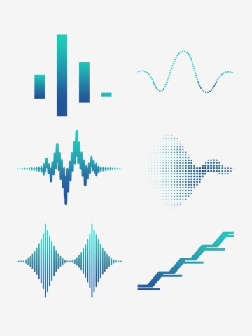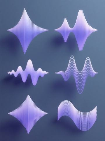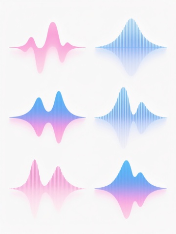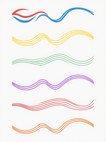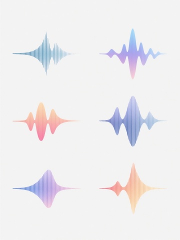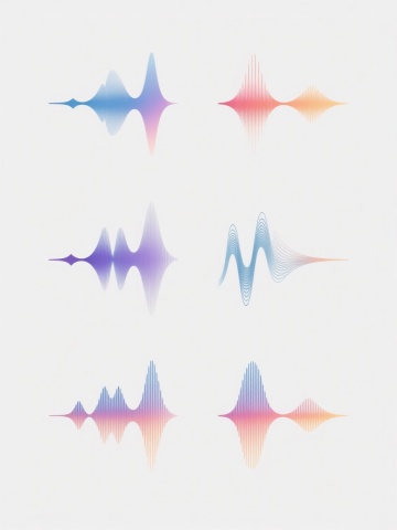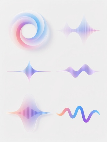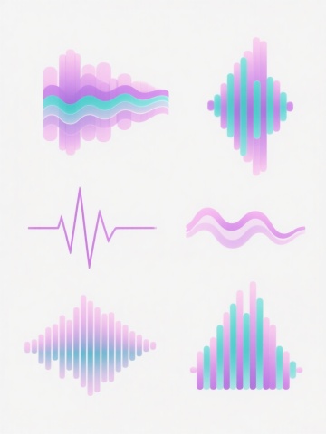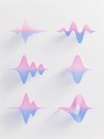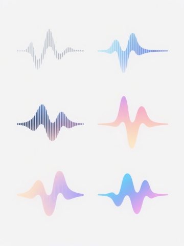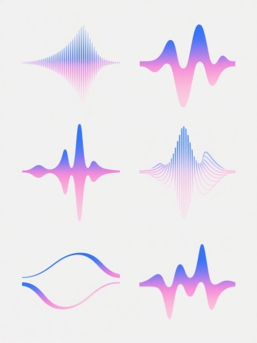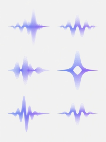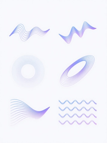 白色背景上,由6个完全不同造型的渐变线条波浪元素组成的系列素材集合,每个波浪元素均采用细腻流畅的曲线线条构成,保持原有的蓝紫色渐变色彩体系,线条呈现出从浅到深的渐变过渡效果,整体风格简约现代,具有科技感和流动感,6个波浪元素规整排布,形成统一且富有变化的视觉整体,无文字及二维码等元素。