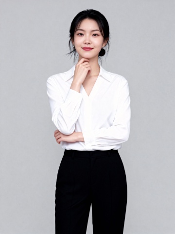 专业客服人员肖像,正面站立姿势,双手交叠于身前,佩戴黑色麦克风耳机,穿着黑色职业西装外套与白色衬衫,简洁灰色背景,柔和均匀的正面光源,清晰的面部表情与职业形象,高清晰度商业人像摄影风格,人物性别为男性,短发,面部轮廓分明,眼神专注且友好,保持专业客服的职业气质与着装规范,整体画面简洁大方,突出职业形象与亲和力。