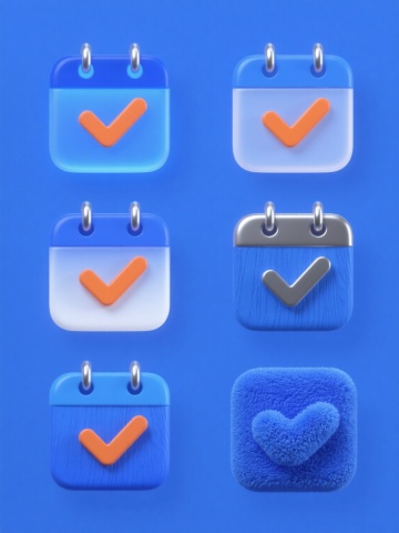 一组6个完全不同材质的同元素、同造型系列素材集合,规整排布在纯色背景上,每个素材均为圆角正方形图标内含有一个白色对勾符号,整体色彩变换,材质分别为:光滑塑料质感、磨砂金属质感、哑光陶瓷质感、木纹纹理质感、透明玻璃质感、毛绒布料质感,每个素材保持原元素内容,造型一致,色彩各异,整体呈现出统一又多样的视觉效果,适合作为系列图标使用。