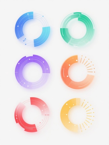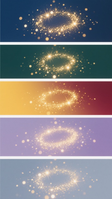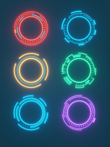 六个排列整齐的圆形发光图案,每个图案都具有相同的数字艺术风格,包含多层发光圆环、放射状光线和闪烁的金色粒子,背景为深色。第一个图案保持原图的金色调;第二个图案变换为蓝色调,光线和粒子呈现出深浅不一的蓝色;第三个图案为紫色调,圆环和光线带有神秘的紫色光芒;第四个图案为绿色调,展现出清新的绿色光晕效果;第五个图案为红色调,光线呈现出温暖的红色光芒;第六个图案为粉色调,带有柔和的粉色光晕和粒子效果。所有图案保持相同的构图和设计元素,仅在色彩上有所变化,整体排列整齐,形成统一而富有变化的视觉效果。