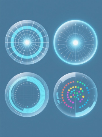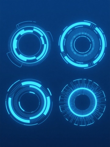 纯黑背景,六个具有高度统一视觉风格的数字艺术光效元素集合,每个元素均保留核心的圆形光晕结构、明亮的中心光点、向外辐射的锐利星芒以及彩色(蓝、红、绿为主)的边缘色散效果,整体呈现出强烈的科技感与未来感,光影对比鲜明,细节丰富。六个光效元素造型完全不同:第一个是标准正圆形光晕配十字星芒;第二个是略微椭圆的光晕配放射状不规则星芒;第三个是中心光点偏移的不对称光晕配多束长短不一的星芒;第四个是光晕边缘带有细微锯齿纹理的圆形配米字形星芒;第五个是中心光点呈六边形的光晕配向外渐细的星芒;第六个是光晕内部带有同心圆纹理的圆形配十字交叉但末端分叉的星芒。所有元素采用相同的蓝紫色调为主、点缀红绿色散的配色方案,以规整的2x3网格形式排布在纯黑背景上,元素间间距均匀,整体构图平衡且具有强烈的系列感和设计感。