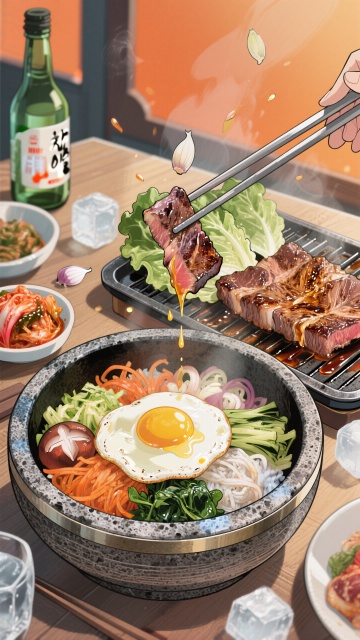 温暖明亮的日料美食插画,日式浮世绘风格,烤架上滋滋作响的烤肉串和烤海鲜,火焰升腾,烟雾缭绕,周围摆放着各种调味小碗和配菜,炭火的暖橙色光芒照亮整个画面,线条流畅,色彩浓郁,充满烟火气和生活气息,细节丰富,构图饱满,具有传统日式绘画的韵味和质感