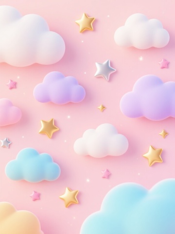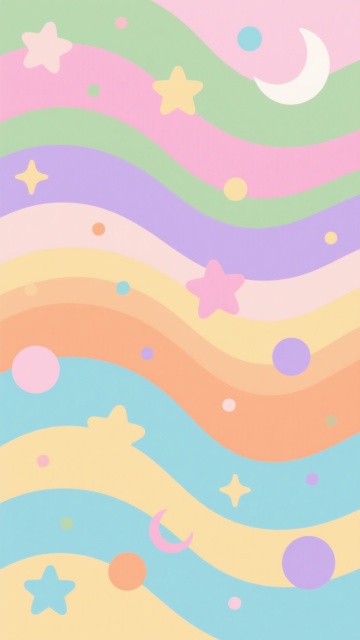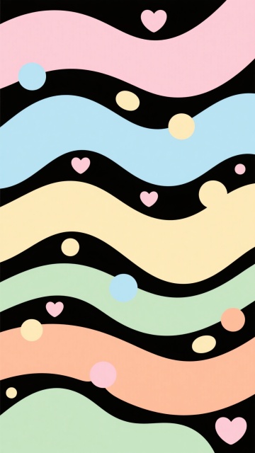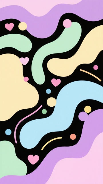 卡通风格背景插画,柔和渐变的马卡龙色系,包括淡粉、浅蓝、鹅黄、薄荷绿和奶油白等,画面由不规则的有机波浪形状色块构成,色块边缘圆润平滑,分布着大小不一的彩色心形和椭圆形装饰元素,整体构图轻盈活泼,充满童趣,营造出温馨甜美的氛围,色彩搭配和谐统一,视觉效果清新明快。