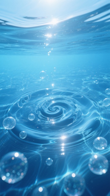 写实风格的水下摄影照片,清澈透明的蓝色水域,水面波光粼粼,阳光透过水面形成明亮的光束,照亮水中悬浮的细小气泡,底部呈现自然的水波纹光影效果,整体画面宁静、通透,充满梦幻般的光影氛围,色彩以深浅不同的蓝色为主调,光影对比柔和,细节清晰,具有真实水下环境的质感和视觉效果。