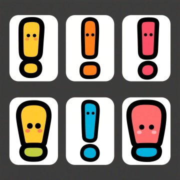 极简风格矢量插画,六个不同配色、不同样式、不同材质的感叹号造型,白色背景,上下两行对齐排列,每个感叹号均采用黑色描边勾勒轮廓,内部填充鲜明色彩,具有圆润边角和轻微立体阴影效果,整体构图简洁平衡,图形元素清晰可辨,色彩对比明快,符合现代简约设计感。
