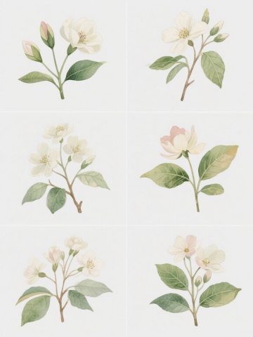 水彩风格插画,纯白色背景,一株藤蔓蜿蜒向上,枝头开满粉色蔷薇花,花瓣边缘带有柔和的水彩晕染效果,花蕊呈淡黄色,点缀着细小的白色花粉,藤蔓上长着深绿色的卵形叶片,叶片边缘有细微的锯齿,叶脉清晰可见,部分叶片带有浅绿色的嫩芽,整体画面清新自然,色彩过渡柔和,保持水彩特有的透明质感和湿润笔触,藤蔓的弯曲形态自然流畅,花朵和叶片的布局疏密有致,营造出优雅恬静的氛围。