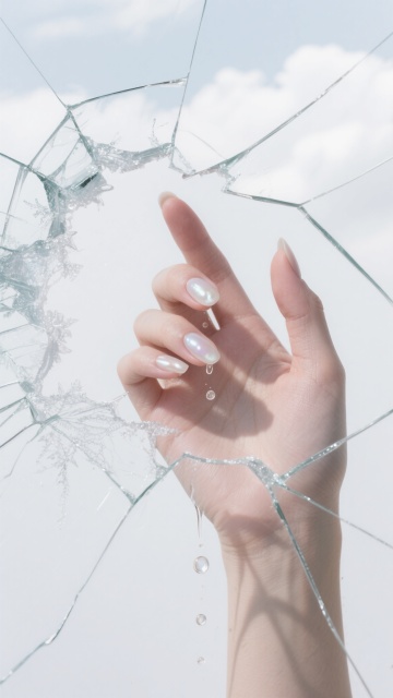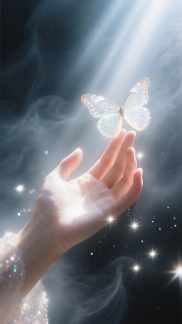 特写镜头,一位身着18世纪洛可可风格蕾丝袖口的贵族女性,其修长手指涂着淡粉色珍珠光泽指甲油,正以食指向上伸直、其余手指自然弯曲的优雅姿态,轻触一只悬浮在晨雾中的机械蝴蝶翅膀,蝴蝶的齿轮与薄纱翅膀在光束中折射出彩虹光晕,手腕处垂落的蓝宝石手链随动作微微晃动,手部皮肤细腻白皙并泛着珍珠母贝般的自然光泽,关节处有精致凹陷,手掌内侧和手指根部的阴影在柔光下形成立体层次,背景是朦胧的凡尔赛宫镜厅局部与漂浮的金色光点,色调以象牙白为基底,点缀着淡粉与宝石蓝的优雅碰撞。