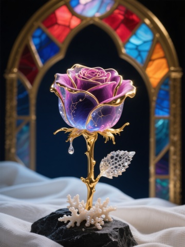 1. 特写镜头,由液态黄金在黑色天鹅绒背景上流动凝固而成的玫瑰,金属光泽随光线折射出暖金色涟漪,花瓣边缘保留流动时的拉丝质感,花茎如熔化的金丝自然垂落,极简构图凸显贵金属的奢华流动感。