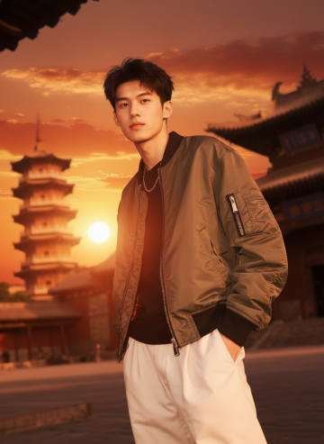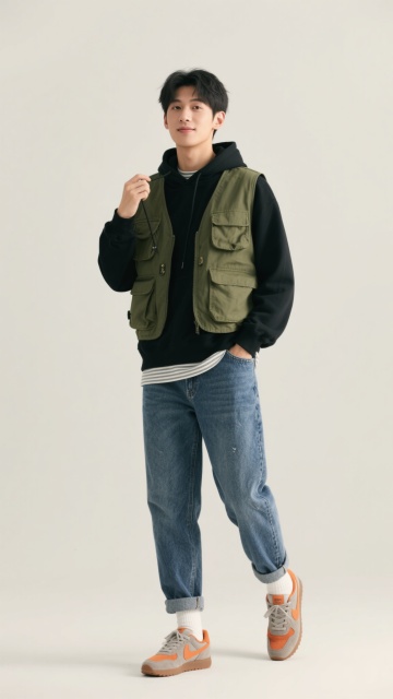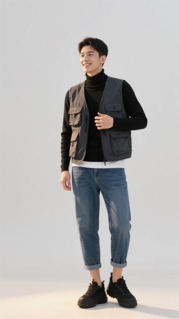 全身中景,年轻男性身着炭黑色高领针织衫(外搭灰蓝色牛仔夹克,袖口随意卷起露出白色条纹T恤边),搭配深军绿色多口袋工装直筒裤,裤脚部分微收露出黑白棋盘格帆布鞋,左手自然下垂握着半开的黑色帆布背包带,右手插在裤袋中,身体重心偏向一侧形成自然S形曲线,嘴角带着若有若无的微笑。整体为高清晰度的商业服装摄影风格,简约干净的浅灰色纯色背景,45度侧前方柔光光源,在地面形成柔和渐变阴影,突出牛仔面料的做旧纹理与针织衫的细腻质感,人物站姿兼具随性与利落,展现都市休闲的层次感穿搭效果。
