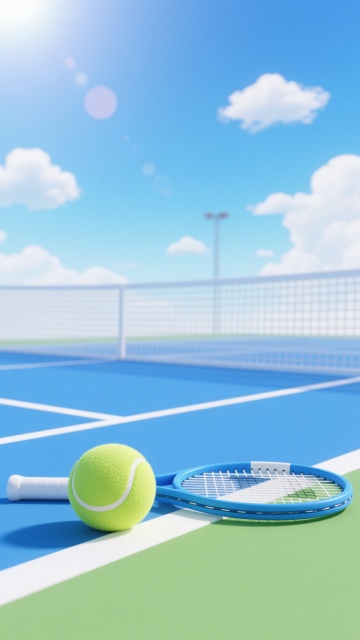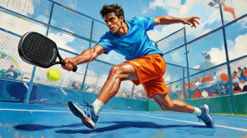 动漫风格插画,一位男性网球运动员正全力挥动球拍击球的瞬间,红色运动服搭配深色短裤,白色运动鞋与长袜,背景由大块面的蓝色、白色和红色几何色块构成,呈现出动态的倾斜角度和速度感,线条流畅且富有张力,整体色彩鲜明对比强烈,人物姿态舒展充满力量,画面传达出运动的激情与活力,扁平化设计语言,简洁而富有冲击力的视觉效果。