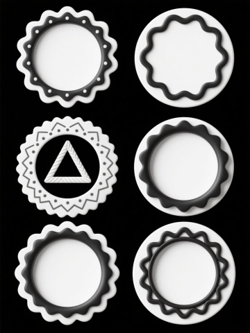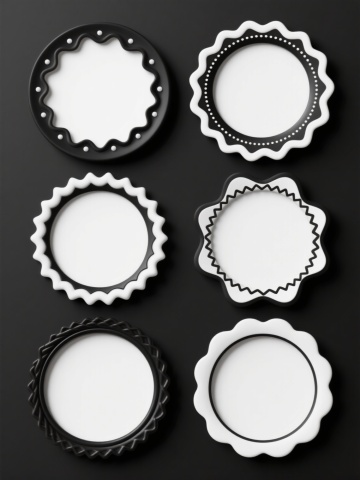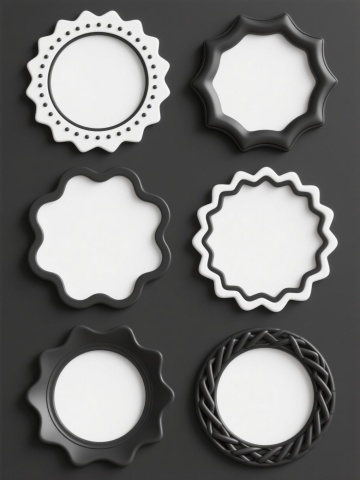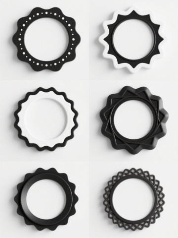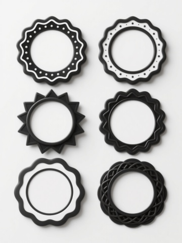 软3D风格的圆形装饰边框集合,九个不同设计的黑白圆形边框整齐排列成三行三列,每个边框都具有独特的波浪形、锯齿形、点状或编织状边缘,线条平滑圆润,带有轻微的立体阴影效果,整体呈现出简洁现代的设计感,白色背景使黑色边框更加突出,适合作为徽章、标签或装饰元素使用。