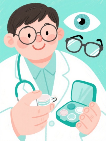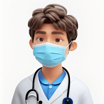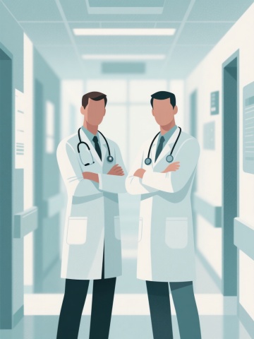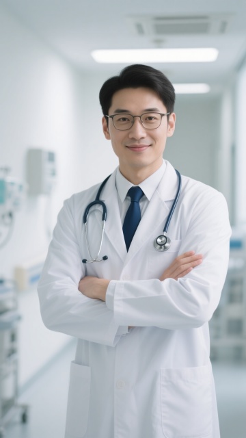 扁平风格卡通医生插画,戴着圆形眼镜,黑色短发,面带微笑,穿着白色医生大褂,内搭蓝色衬衫和领带,脖子上挂着听诊器,双臂交叉在胸前,整体采用简洁明快的线条,色彩鲜明柔和,无背景,形象亲切专业。