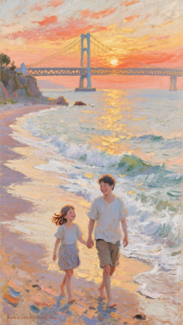 印象派风格油画,以深邃的靛蓝与神秘的紫罗兰为主色调的黄昏天空,云层被染成渐变的粉紫与钴蓝,厚重的油彩笔触堆叠出丰富肌理。前景是覆盖着初雪的乡间小路,积雪泛着冷冽的青灰反光,路两旁是挂满红色浆果的光秃灌木。中景处坐落着几座北欧风格的尖顶木屋,墙面呈现斑驳的灰蓝与赭石色,屋顶覆盖着厚厚的白雪,烟囱中冒出袅袅白色炊烟。一对穿着深色大衣的行人手牵着手走在雪路上,背影被夕阳拉长投在雪地上,远处的树木枝条上凝结着晶莹的雾凇,整体画面营造出寒冷而温馨的冬日乡村氛围,光影对比强烈,色彩浓郁饱满,笔触奔放富有动感。
