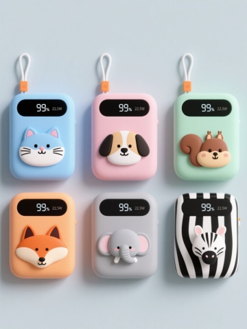 6个不同花纹的充电宝系列素材集合,每个充电宝保持相同的简约3D立体风格,具有光滑圆润的边角、细腻的哑光质感和清晰的接口细节,分别采用6种不同的纯色背景,每个充电宝表面装饰有独特的简约花纹(如几何图案、波浪线条、点状纹理、条纹组合、抽象图形、植物轮廓),整体色彩明快清新,所有充电宝呈规整的网格状排布,画面干净整洁,光影柔和统一,突出产品的现代简约设计感。