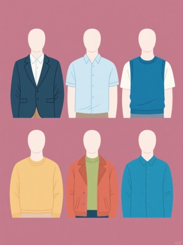 一组6个规整排布的插画风格素材集合,每个素材均为纯色背景,展示不同款式的男士上半身商务着装,保持元素类目为西装、衬衫、领带的组合。整体采用扁平化插画风格,线条简洁流畅,色彩平涂无渐变,边缘清晰锐利。每个素材变换不同的整体色彩方案:1. 深蓝色西装+白色衬衫+酒红色领带配浅灰色背景;2. 炭灰色西装+浅蓝色衬衫+深蓝色领带配米白色背景;3. 藏青色西装+浅粉色衬衫+深绿色领带配淡蓝色背景;4. 黑色西装+浅紫色衬衫+银色领带配浅棕色背景;5. 深棕色西装+白色衬衫+蓝色条纹领带配浅绿色背景;6. 深绿色西装+浅灰色衬衫+橙色领带配浅黄色背景。所有素材保持一致的构图角度(正面上半身)、相同的视觉比例和布局,形成风格统一、色彩多样的商务着装系列插画,无任何文字或标识元素。