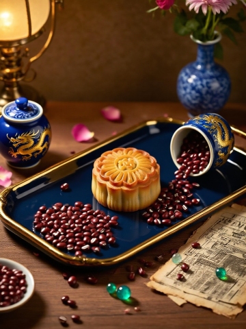 微距摄影风格的月饼主视觉,左侧红色高脚碟上放置一个完整的莲蓉蛋黄月饼和一个切开露出紫色内馅的月饼,右侧黑色石板上摆放一个完整月饼和两个切开的不同口味月饼,旁边散落着几颗红豆和一把木质小叉子,背景有黑色茶壶和绿叶装饰,整体采用清新明亮的蓝绿色调,柔和的侧逆光营造出通透的光影效果,月饼表面纹理清晰可见,背景为浅灰色渐变,无任何文字元素,构图遵循三分法原则,突出月饼的立体感和质感。
