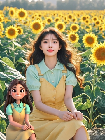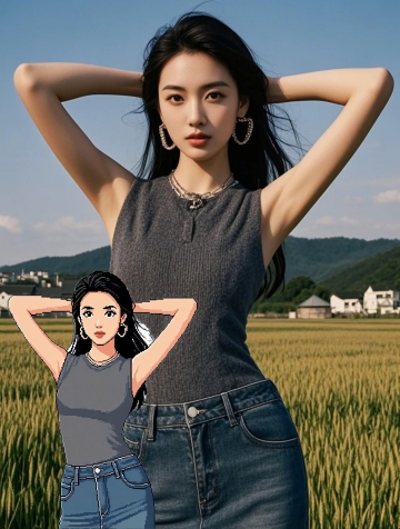 实景与漫画交融,清新田野间展现时尚感,插画风增添趣味。